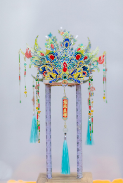 本次大赛收到的作品,题材广泛,形式多样,充分展现了创作者们的巧妙构思与精湛技艺。其中,一件名为《青鸾凤冠》的作品尤为引人注目,创作者以不同面值、不同色彩的刮刮乐彩票为材料,通过精密的裁剪和层叠拼贴,惟妙惟肖地复刻了凤冠的造型。以福彩刮刮乐饰孔雀翎羽,金翠交辉,似青鸾、凤凰为灵韵。它不仅是传统工艺的精美呈现,更寄寓着平安健康、龙丰呈祥的美好愿望;在华贵雅致之间,传递出浓厚的古典祥瑞之意,最终荣获本次大赛立体拼接组一等奖。