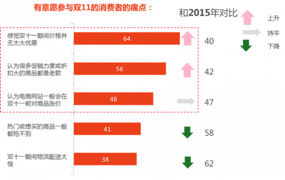 3.促销和折扣主导着消费者的参与意愿,最受吐槽的是“感觉双十一期间价格并无太大优惠”。